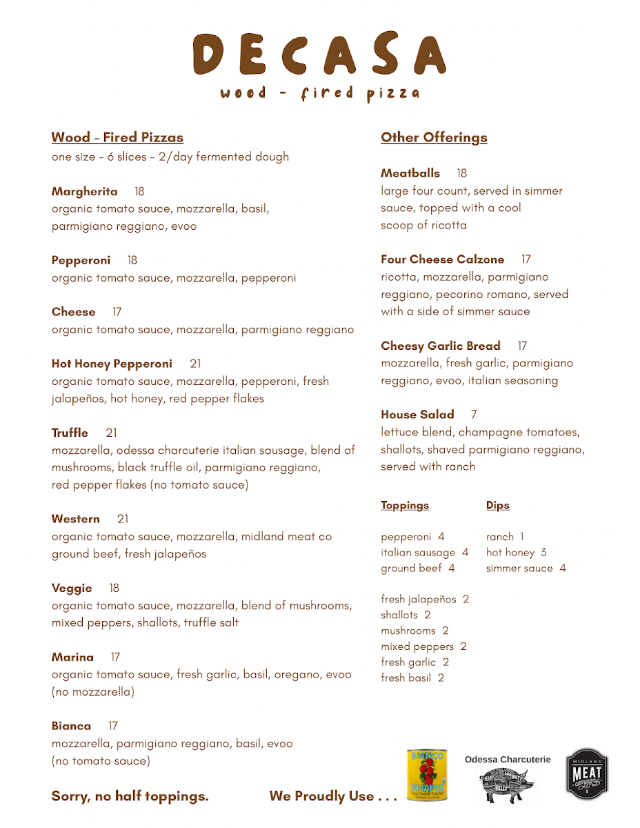 Welcome to Decasa Wood-Fired Pizza, a hidden gem nestled in Midland, Texas, where every bite transports you to pizza paradise. The menu showcases a range of wood-fired pizzas, each crafted with fresh ingredients and a perfect crust. Highlights include the classic Margherita and the crowd-pleasing Hot Honey Pepperoni, offering a delightful contrast of flavors. Other options, such as the Truffle and Veggie, further enhance your dining experience.